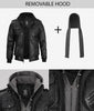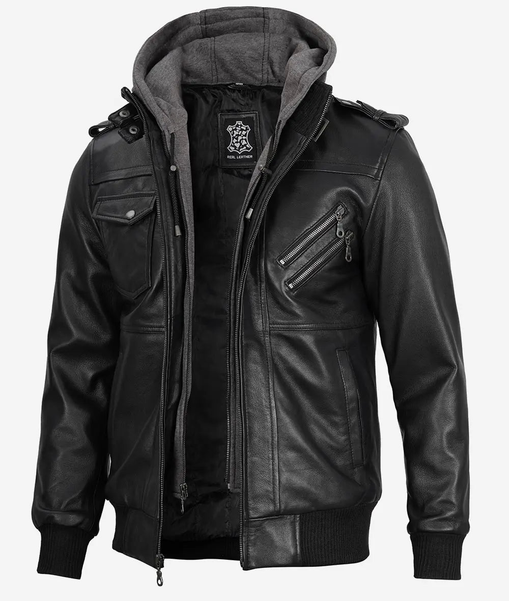 Schwarze Herren-Lederjacke mit abnehmbarer grauer Kapuze